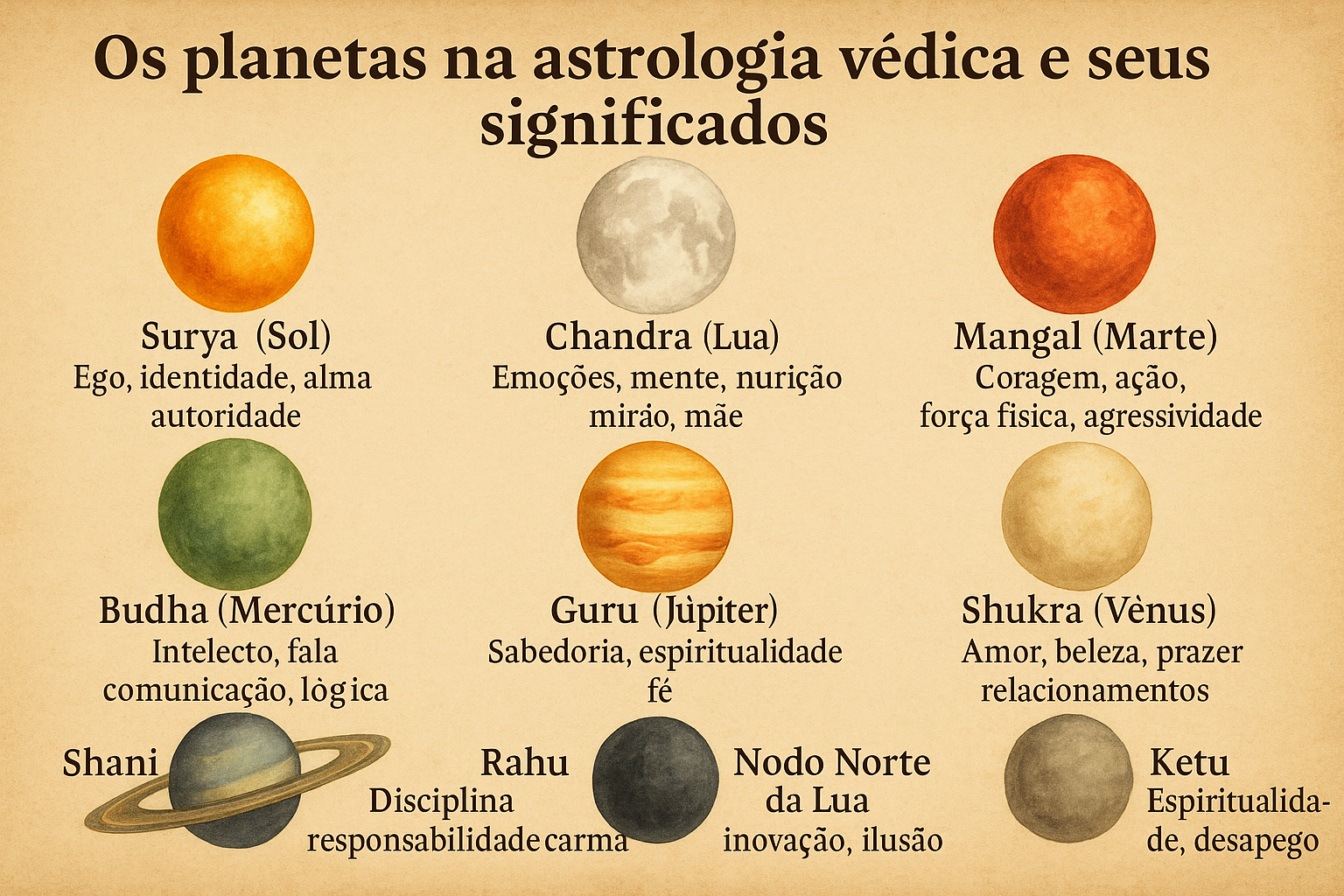 Na astrologia védica, são considerados os seguintes “planetas” (incluindo os nodos lunares):