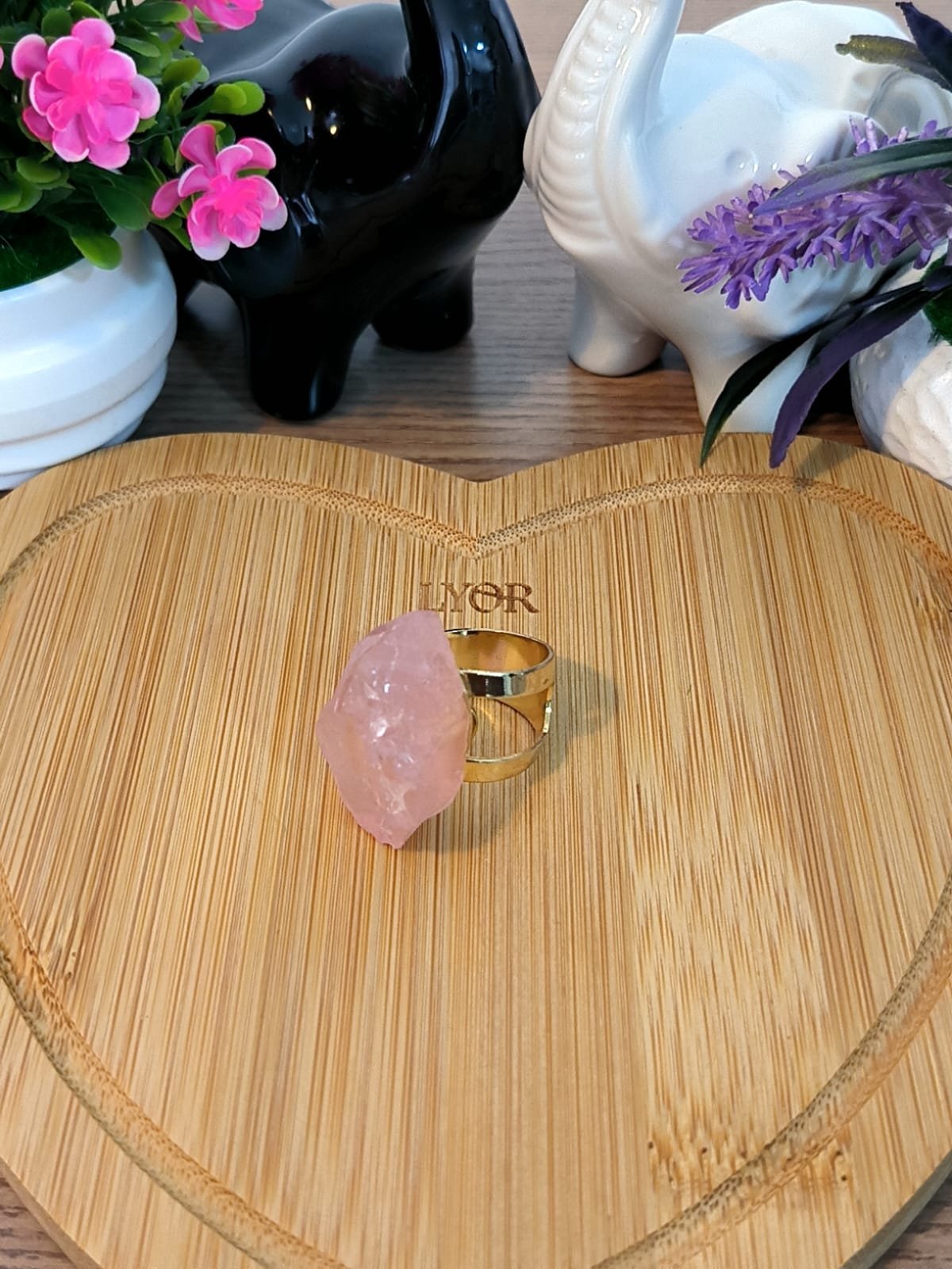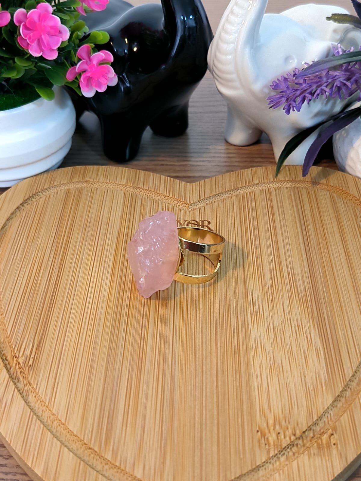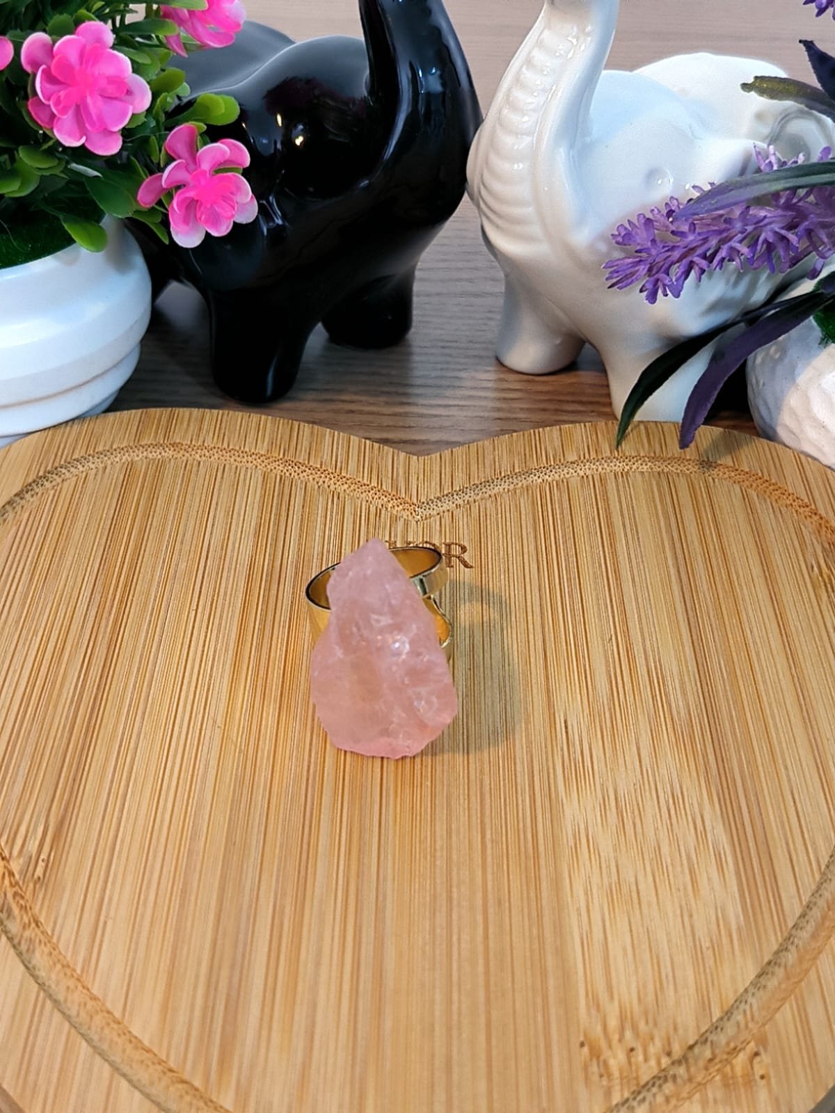 Anel de Quartzo Rosa bruto, pedra do amor universal. Ideal para cura emocional, autoestima, harmonia e vibração amorosa.