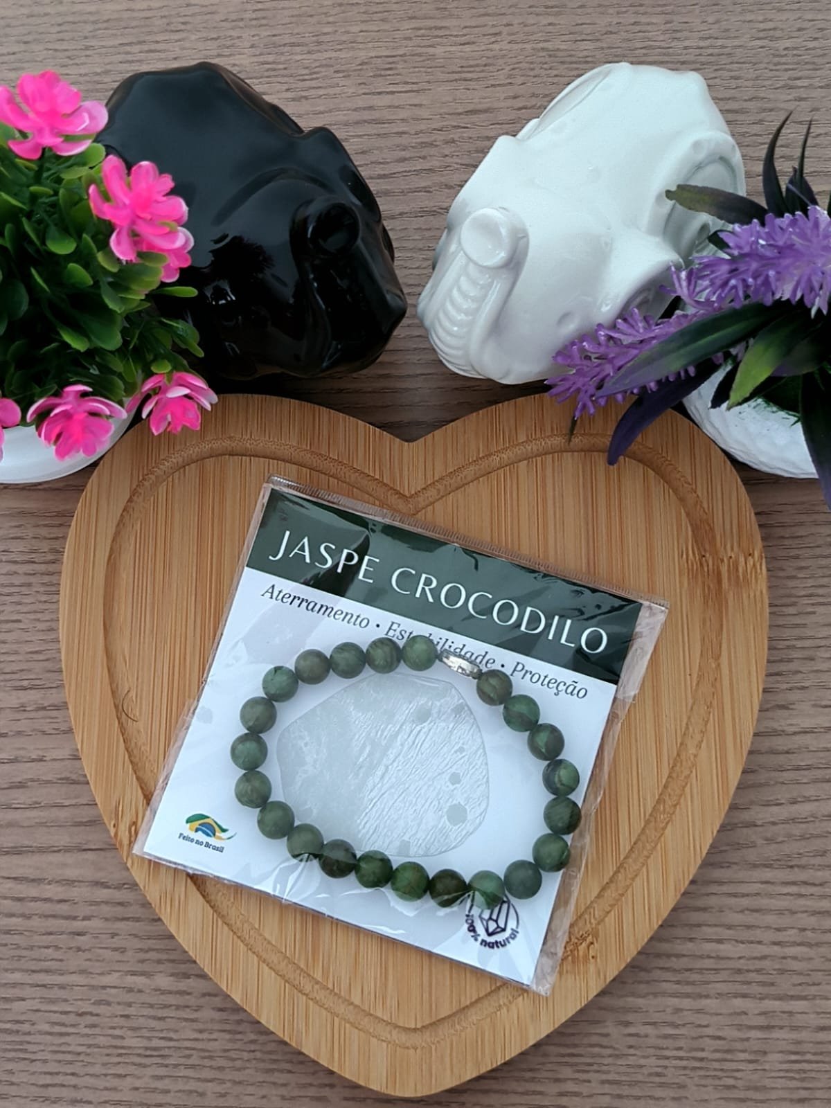 A Pulseira de Jaspe Crocodilo carrega a vibração ancestral da Terra. Sua energia firme traz estabilidade emocional, autoconfiança e proteção, especialmente em momentos de desafios.