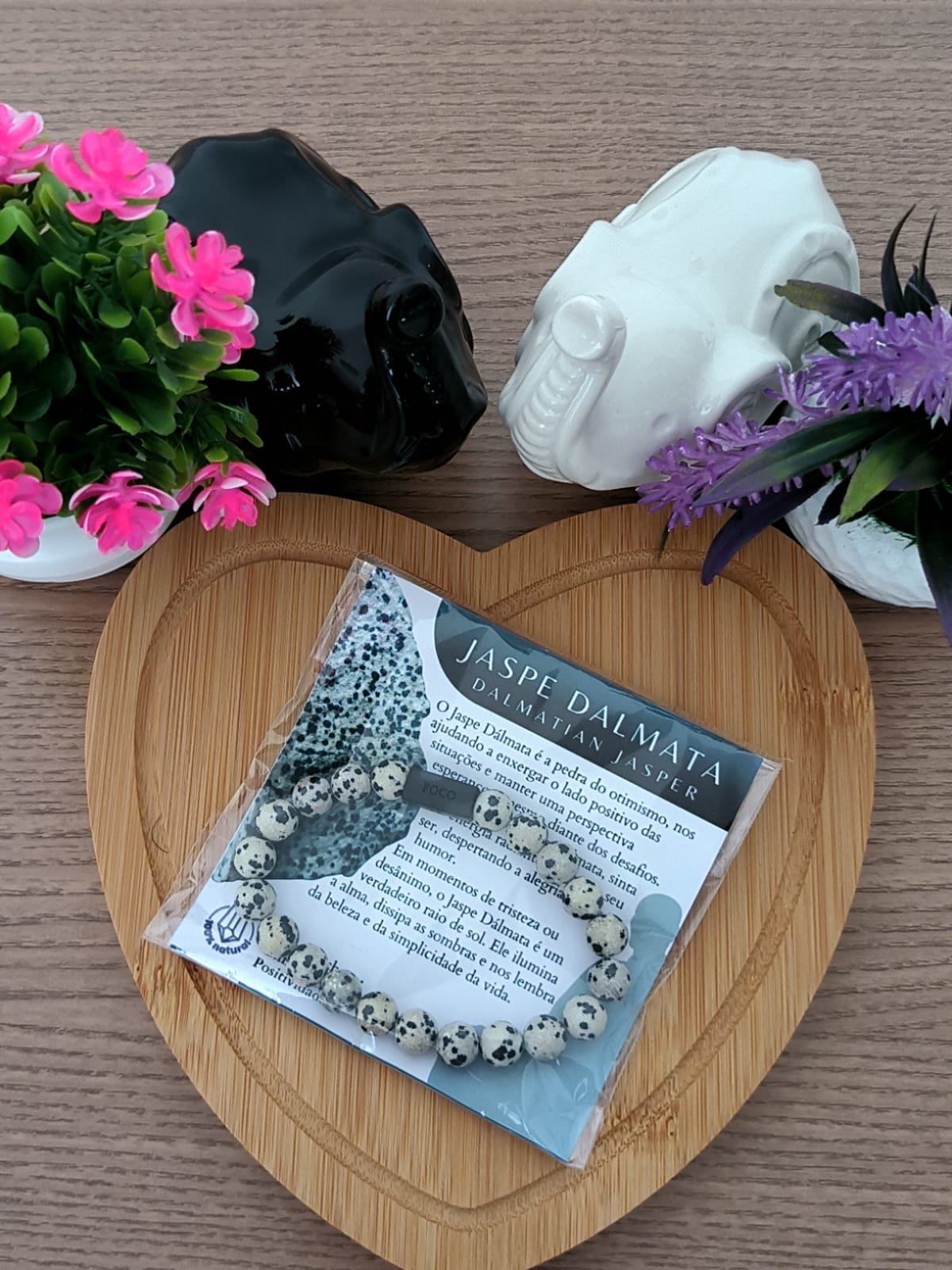 O Jaspe Dálmata é uma pedra leve e protetora, conhecida por dissipar pensamentos negativos e restaurar o bem-estar. Atua no chakra raiz, fortalecendo foco, disciplina e equilíbrio emocional.